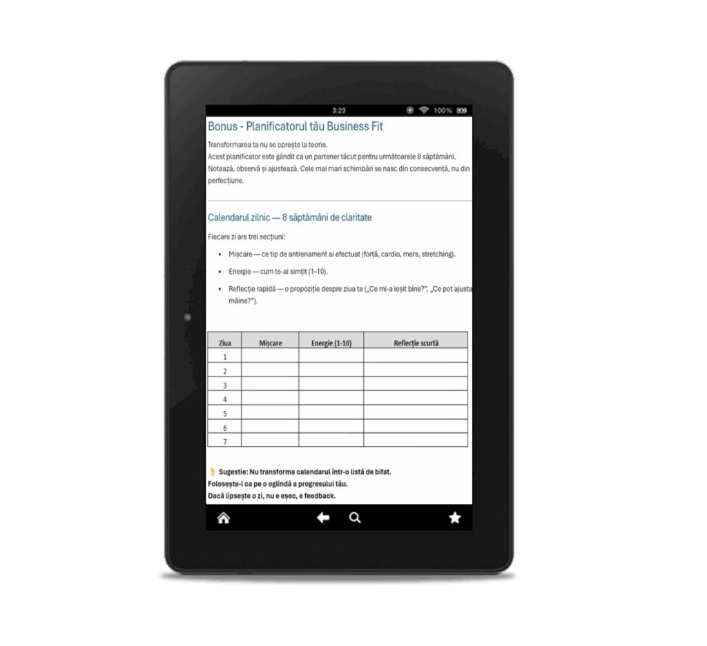 Nu. Este un manual de principii și exemple. Conține exemple de antrenament complet pentru o zi (o sesiune de antrenament), dar E-bookul tratează multiple arii, nu numai mișcarea. Pentru antrenamente detaliate pe zile, săptămâni etc, există opțiunea de achiziționare a programelor 40+ RESET, care au preț promoțional (-40%) în această perioadă.